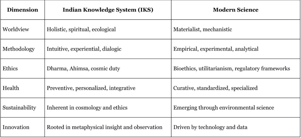 Bridging the Indian Knowledge System and modern science is both a philosophical imperative and a practical opportunity. Integrating empiricism, reductionism, technological innovation, and biomedical practice with IKS strengths—long‑horizon thinking, systems medicine, disciplined inference, ecological ethics, and place‑sensitive design—creates a richer epistemic toolkit for health, environment, materials, and governance. This requires transdisciplinary research, plural methodologies, and ethical anchoring: adaptive trials testing Ayurvedic prevention alongside biomedical care, bioclimatic and Vastu‑informed urban pilots, materials research on traditional technologies, and computational philology with AI. Institutional reforms—long‑term funding, curricula in plural epistemologies, and governance protecting knowledge custodians—are essential to cultivate epistemic humility and deliver resilient, equitable, context‑aware solutions.