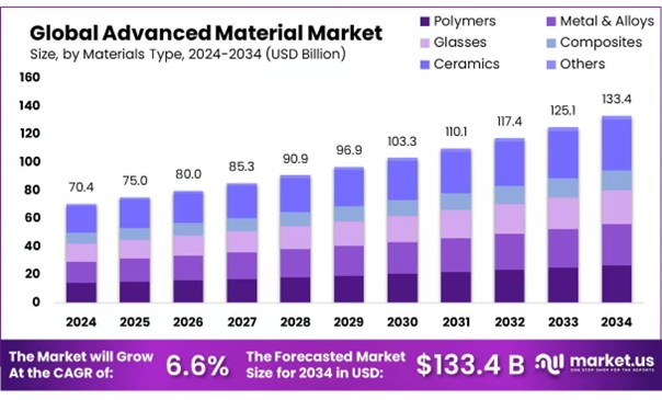 The interdisciplinary approach of materials science, nanotechnology, and computational design is reshaping the boundaries of 21st-century innovation. In the upcoming years, advanced materials are expected to fuel substantial economic growth, as depicted in Figure 2 based on analyses by Market.us News.